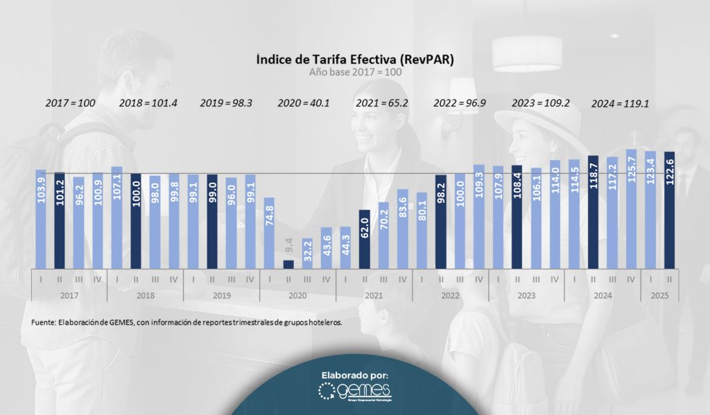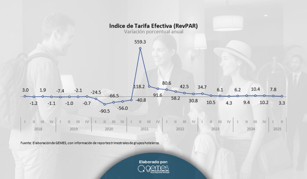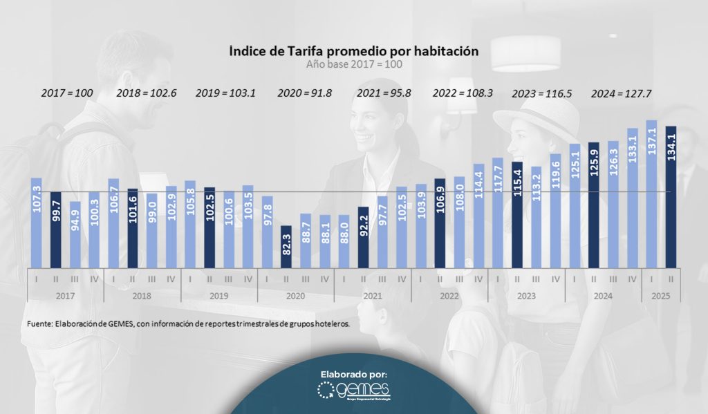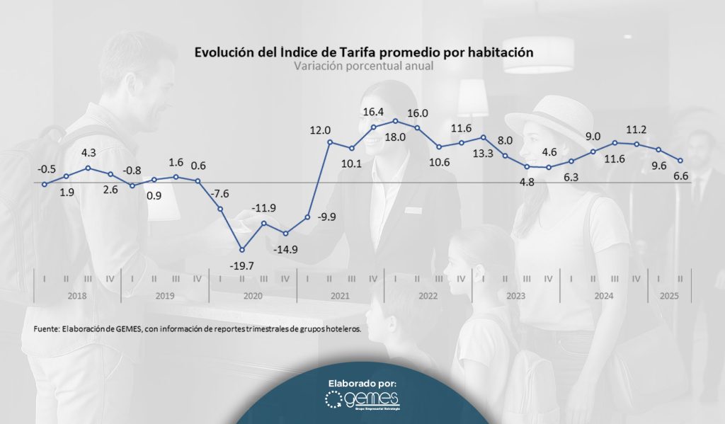 De hecho, a tasa anual, comparado con el mismo trimestre del año 2024, la tarifa promedio registró un crecimiento de 6.6% que supera la tasa de inflación general de la economía, por lo cual la tarifa hotelera promedio se ha incrementado en términos reales en los últimos trimestres.