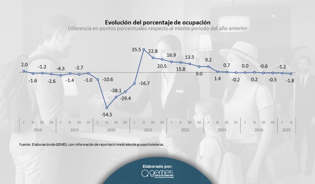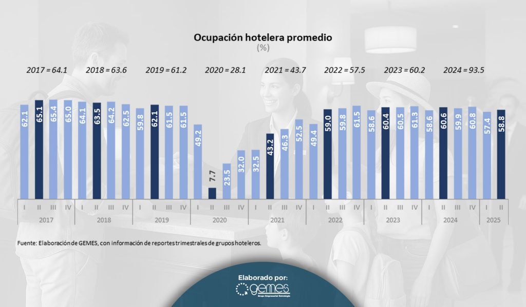 El porcentaje de ocupación hotelera tuvo un mejor desempeño, ya que se incrementó 1.4 puntos porcentuales respecto al primer trimestre, aun cuando en términos generales los niveles de ocupación de esta año han sido menores a los registrados en 2024 y no alcanzan aún los niveles previos a la pandemia.
