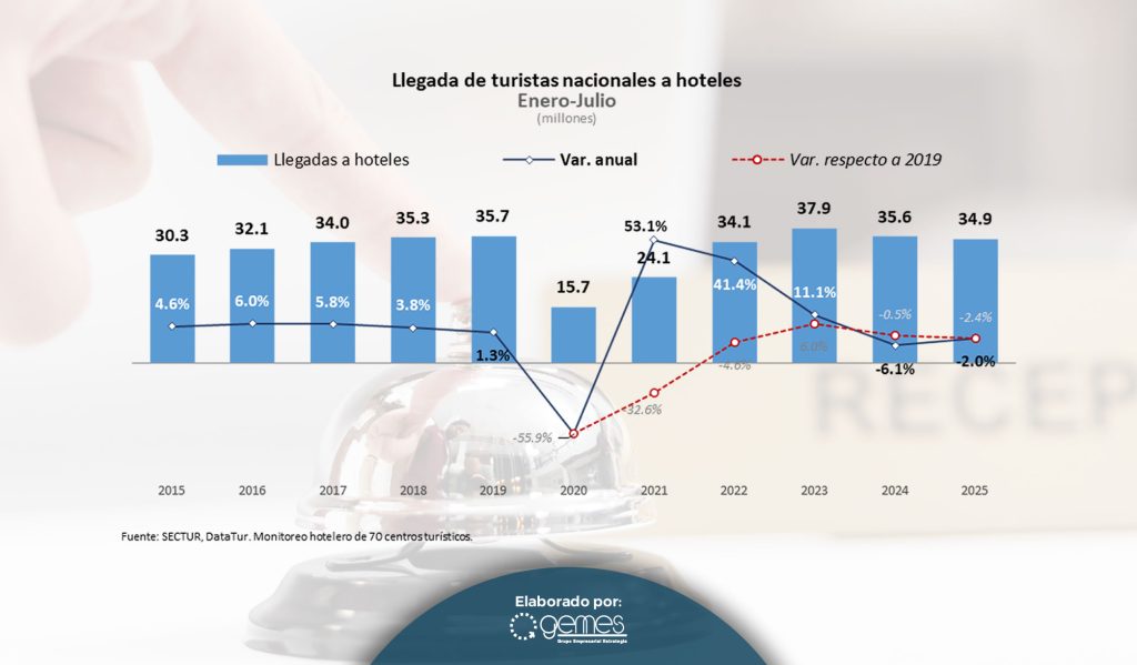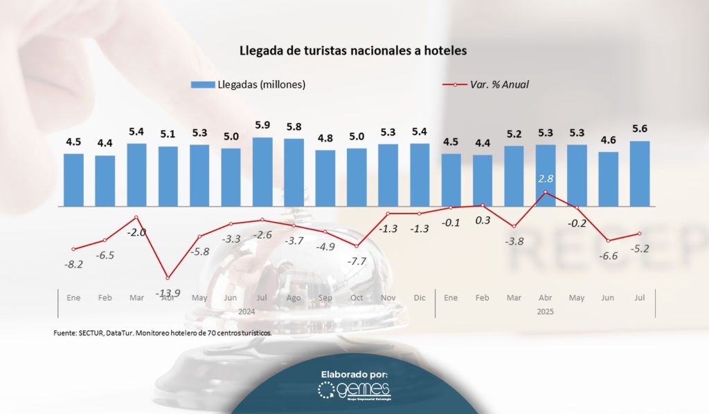La gráfica siguiente muestra la evolución mes a mes de la llegada de turistas nacionales a hoteles, en la que se puede apreciar disminuciones, a tasa anual, en la mayoría de los meses. El número de turistas nacionales que llegó a hoteles durante el mes de julio de 2025 alcanzó 5.6 millones de turistas, con una variación anual de -5.2% respecto al año anterior.
