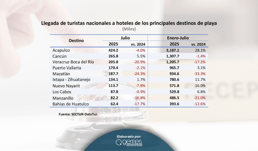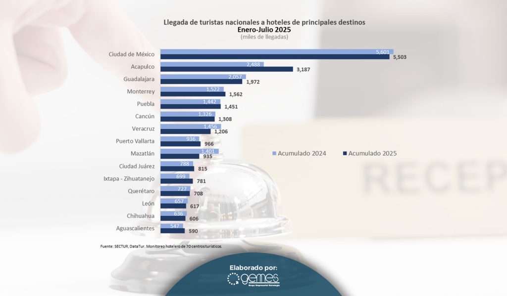 Entre los destinos de playa más importantes, únicamente en los hoteles de Acapulco, Puerto Vallarta e Ixtapa-Zihuatanejo, registraron aumento en la llegada de turistas nacionales durante el periodo enero-julio de 2025 respecto al año anterior. En el caso de Cancún, Veracruz y Mazatlán se observan disminuciones. Por lo que se refiere a los destinos de ciudad, adicional a la capital del país, se observa un crecimiento de 2.7% para la ciudad de Monterrey, en Ciudad Juárez una variación positiva de 3.4% y un aumento de 7.9% en Aguascalientes; en el caso de Guadalajara para el periodo en cuestión se observa una contracción de -4.1 por ciento.
