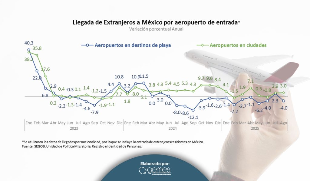 Durante el mes de agosto la llegada de visitantes por vía aérea a destinos de ciudad registro un crecimiento de 3.0%, sin embargo, la llegada a destinos de playa mostró una caída de -4.0% respecto al mismo mes de 2024.