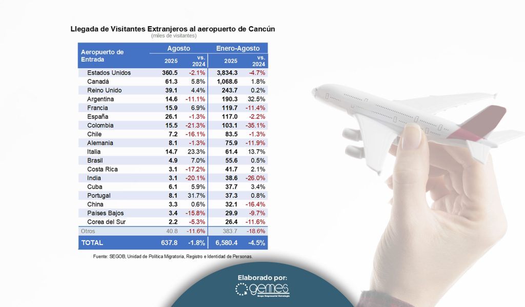 A pesar de seguir siendo el principal punto de entrada, el aeropuerto de Cancún, que representó el 44.1% del total de llegadas vía aérea a México, durante el mes de agosto mostró una caída de -1.8%, siendo el principal motor de la caída a nivel nacional. Durante el periodo enero-agosto, el aeropuerto de Cancún registró una disminución anual de -4.5 por ciento.