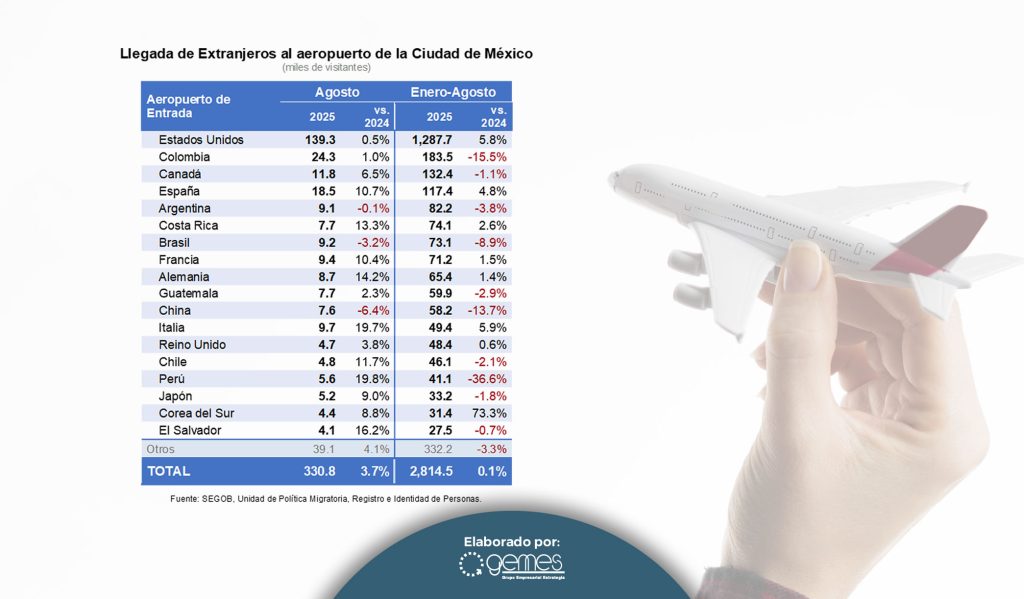 La Ciudad de México muestra una fuerte atracción en mercados que no necesariamente son los más grandes, pero que crecen a doble dígito en agosto como es el caso de Italia (19.7%), Perú (19.8%), Alemania (14.2%), Costa Rica (13.3%) entre otros.