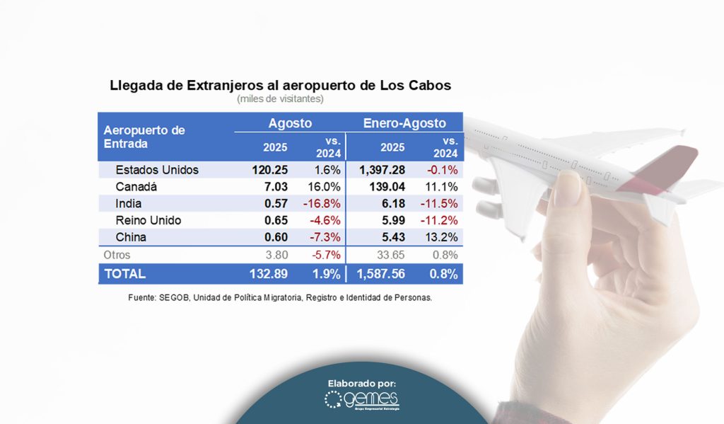 El aeropuerto de Los Cabos se posiciona nuevamente durante el mes de agosto como el tercer aeropuerto más importante del país en cuanto al número de llegadas de visitantes extranjeros con más de 132 mil visitantes internacionales, con un crecimiento de 1.9% en comparación con el mes de agosto de 2024.