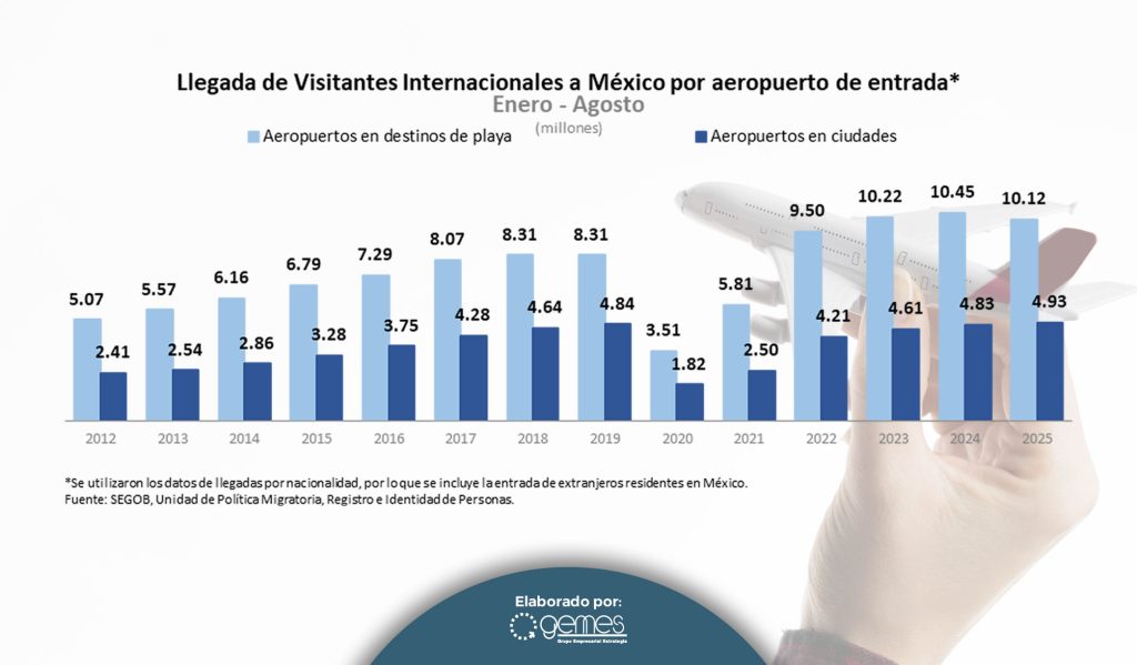 La Unidad de Política Migratoria, a través del Registro e Identidad de Personas de la SEGOB, reportó durante el periodo enero-agosto de 2025 la llegada de 15 millones 066 mil visitantes extranjeros, de los cuales 10.12 millones de visitantes extranjeros llegaron a aeropuertos que se encuentran en destinos de playa, que representan el 60.5% del total de visitantes internacionales, mientras que, para aeropuertos en ciudad, el registro fue de más de 4.93 millones visitantes.