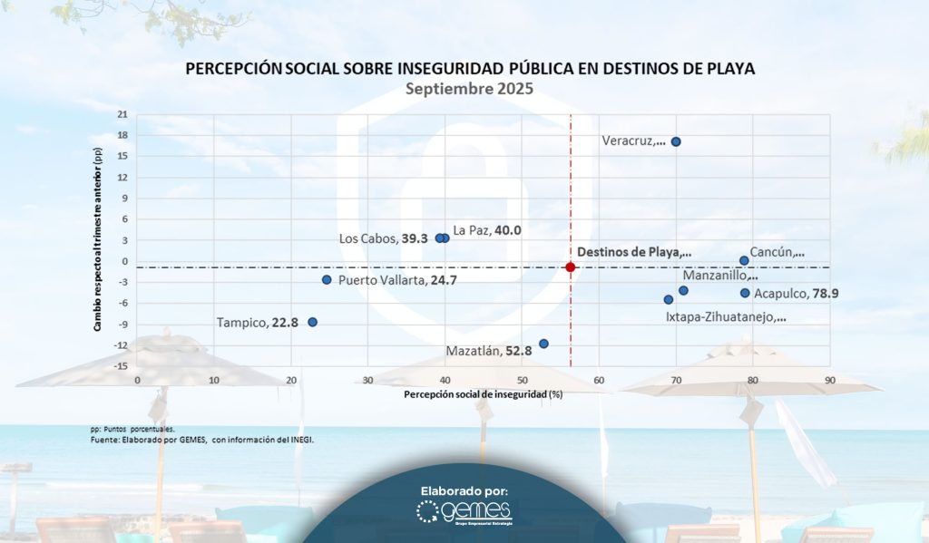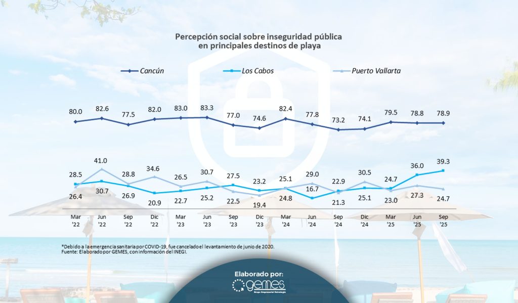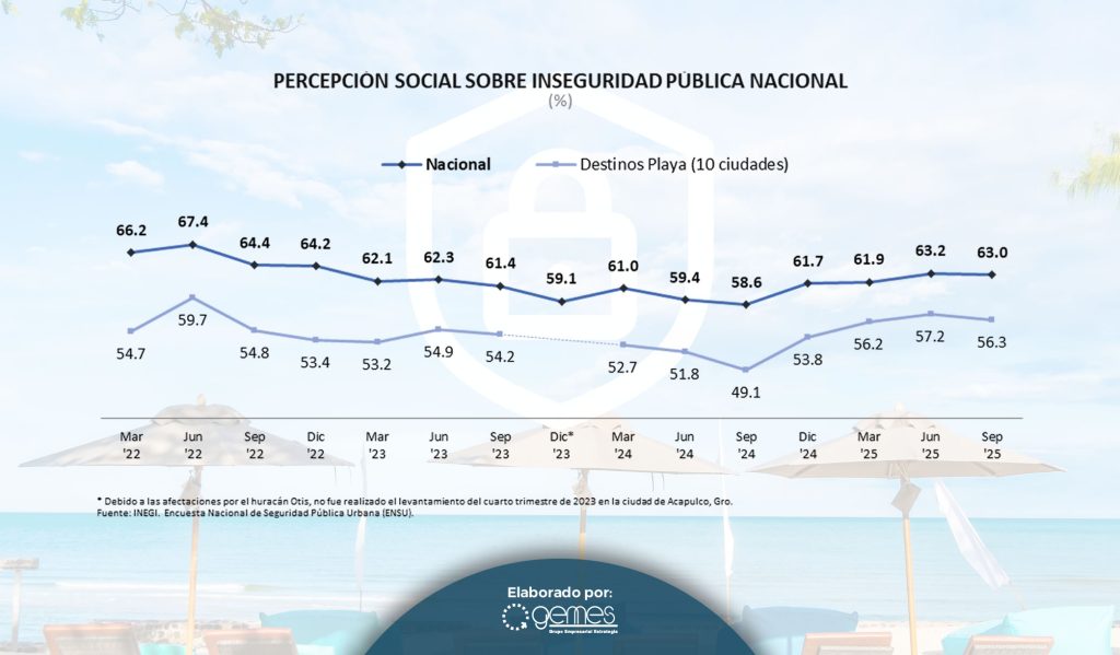 En los destinos turísticos de playa, en los cuales se concentra la mayor parte del turismo internacional que llega a México, al tercer trimestre del año más de la mitad de la población se siente insegura (56.3%), dato que señala un aumento considerable de 7.2 puntos porcentuales en comparación con septiembre de 2024 y una ligera disminución de 0.9 puntos porcentuales en comparación con el trimestre anterior.