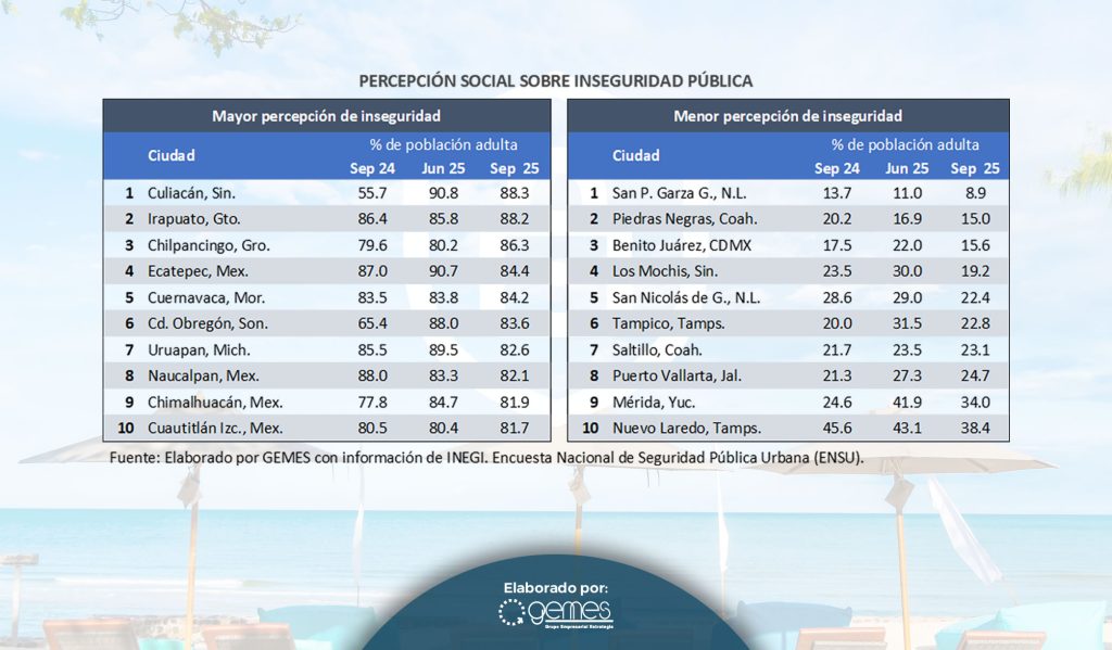 Para septiembre de 2025, las cinco ciudades que destacan por el alto nivel de percepción de inseguridad entre su población son Culiacán (88.3%), Irapuato (88.2%), Chilpancingo (86.3%), Ecatepec (84.4%) y Cuernavaca (84.2%). En comparación con el trimestre anterior, para el tercer trimestre de 2025 salen del listado de las 10 ciudades con mayor percepción de inseguridad las ciudades de Tapachula (79.1%), Fresnillo (75.4%) y Puebla (81.4%) y las ciudades que se incluyen entre las 10 con mayor percepción de inseguridad son Chilpancingo (86.3%), Naucalpan (82.1%) y Cuautitlán Izcalli (81.7%).