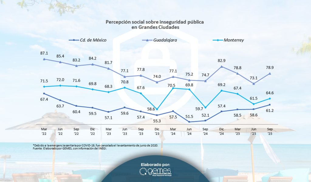 La percepción de inseguridad se mantiene en 63%: 6 de cada 10 mexicanos se sienten inseguros de vivir en su ciudad. En destinos de playa la percepción es de 56.3%.