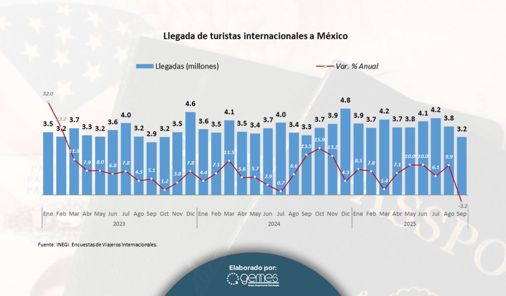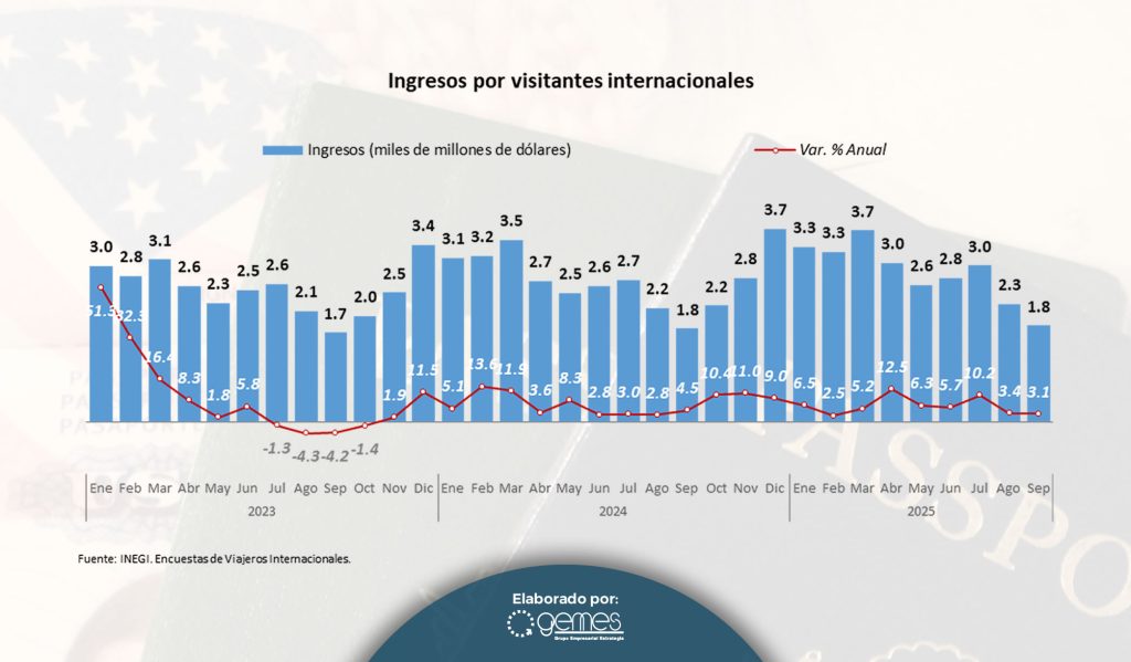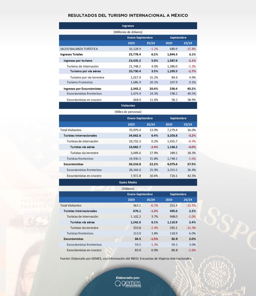 La llegada de turistas internacionales a México durante los primeros nueve meses del 2025 registró un crecimiento de 6.4% impulsado principalmente por los segmentos de consumidores de menor gasto promedio (turistas y excursionistas fronterizos y visitantes de cruceros). Los ingresos por visitantes internacionales mostraron un incremento de 6.2% sostenido, principalmente, por el aumento en el gasto medio de los turistas de alto valor que son los que llegan vía aérea.
