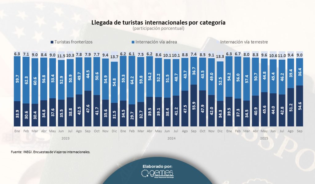 El turismo fronterizo mantuvo su participación porcentual mayoritaria dentro del turismo total; para el mes de septiembre de 2025 la participación fue de 54.6%, que sin embargo, es -1.3 puntos porcentuales menor que en el mismo mes del año anterior. En cuanto a los turistas que llegan por vía aérea, su participación en el total continúa a la baja, lo cual es preocupante ya que es el segmento que más contribuye en términos económicos por el mayor gasto que realizan. Durante el mes de septiembre su participación representó el 36.4% del total de turistas, -0.3 puntos porcentuales menos que el mes de septiembre de 2024 y tres puntos porcentuales menos que en el mes anterior.