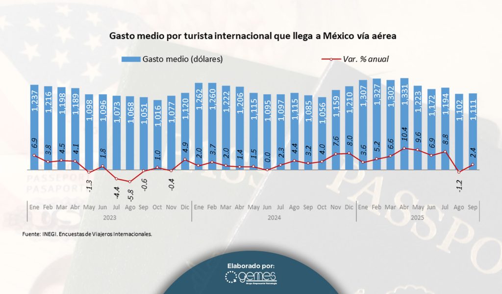 El gasto promedio por turista aumentó 2.2% al registrar 495.6 dólares. El gasto medio del turista que llega vía aérea registró un crecimiento anual de 2.4%, alcanzando 1,110.9 dólares durante el noveno mes del 2025. El incremento en el gasto medio de los turistas aéreos durante los primeros nueve meses del año (6.1%) ha sido fundamental para mantener el crecimiento de los ingresos totales por turismo. El gasto promedio del turista fronterizo fue de 118.9 dólares en septiembre con un crecimiento anual de 6.0% en comparación con el mes de septiembre del año anterior.