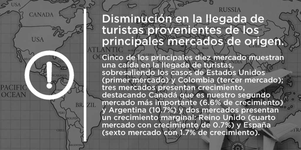 Se observa una contracción en la llegada de turistas provenientes de varios de los más importantes mercados de origen, muy probablemente como consecuencia, al menos en parte, de la falta de presencia de la marca MÉXICO y de promoción de nuestros durante un período de siete años. Durante ese mismo lapso, importantes competidores de nuestro país han estado presentes con campañas innovadoras que han ganado la atención de los consumidores.