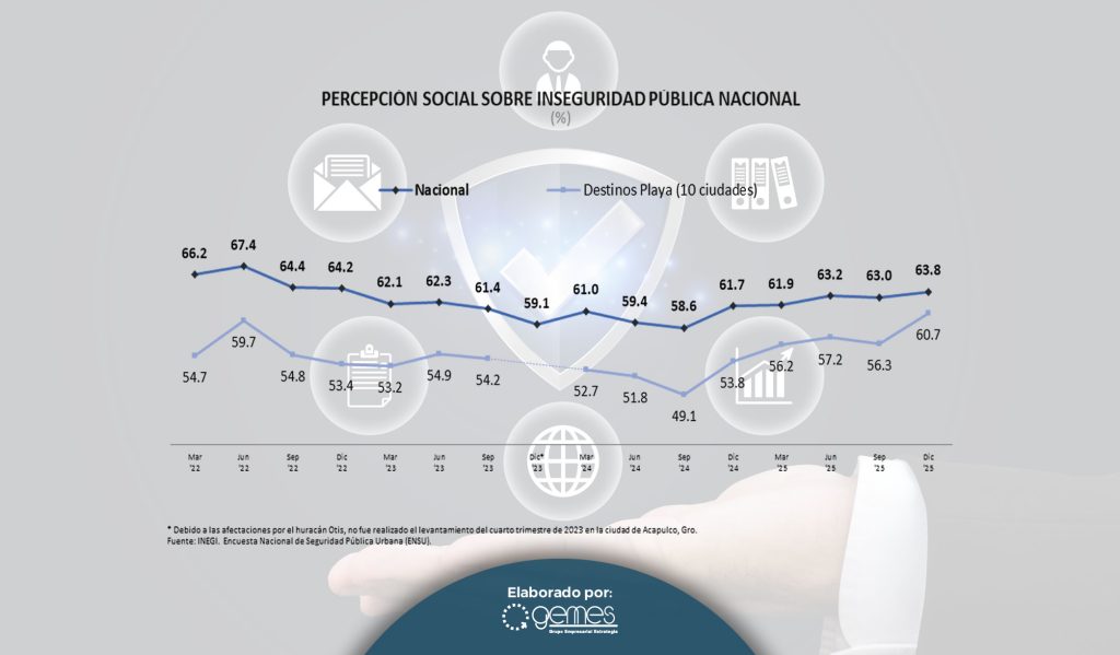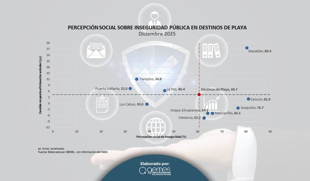 En los destinos turísticos de playa, en los cuales se concentra la mayor parte del turismo internacional que llega a México, al cuarto trimestre del año más de la mitad de la población se siente insegura (60.7%), dato que señala un aumento considerable de 6.9 puntos porcentuales en comparación con diciembre de 2024 y un aumento de 4.4 puntos porcentuales en comparación con el trimestre anterior. La percepción de inseguridad se incrementó en Puerto Vallarta y Tampico, aun cuando estas dos ciudades se mantienen dentro de los diez destinos con menor percepción de inseguridad. También contribuyó a incrementar la percepción de inseguridad en destinos de playa el fuerte incremento registrado en Mazatlán.