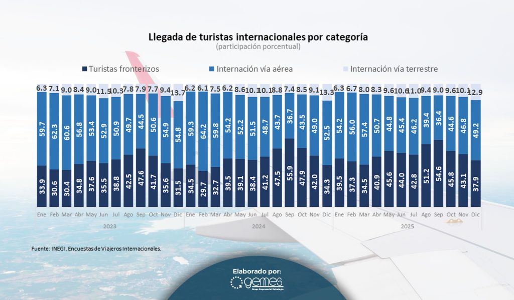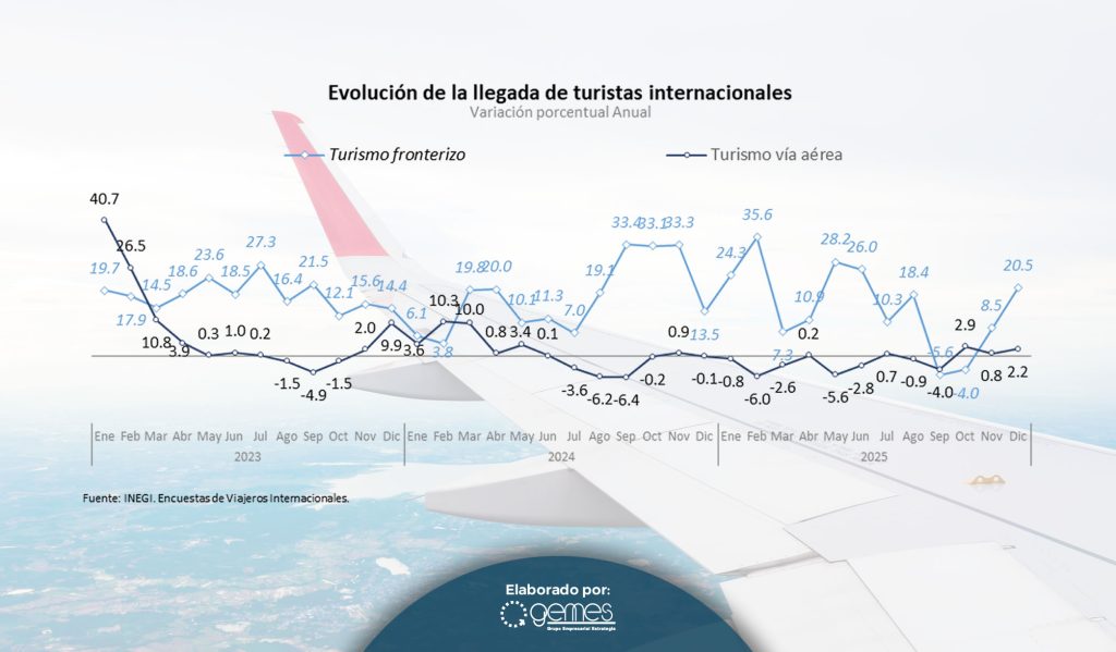 El turismo fronterizo ha tenido un crecimiento fuerte y sostenido desde 2023, con incrementos de dos dígitos tanto en volumen como en ingresos; para el mes de diciembre la llegada de turistas fronterizos creció en 20.5% en su comparación anual y en el comparativo acumulado 13.6%. El turismo vía aérea mostró un aumento de 2.2% durante el mes de diciembre hilando tres meses consecutivos de crecimiento, sin embargo, en su comparación acumulada enero-diciembre registró una caída de -1.3 por ciento.