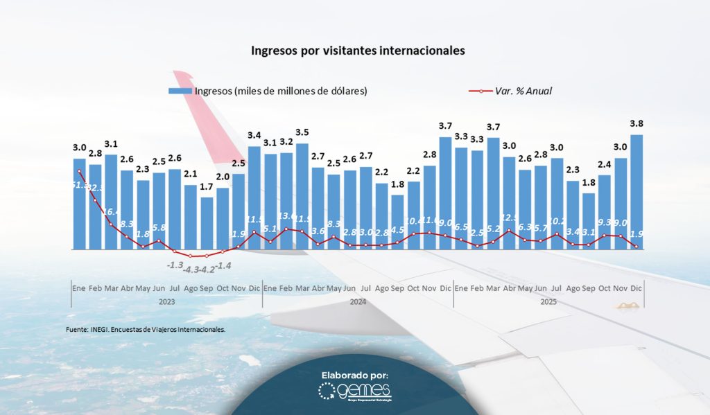 Durante el mes de diciembre de 2025 los resultados fueron favorables, aunque contrastantes y diferentes a los de los meses anteriores: la llegada de turistas mostró su mejor desempeño del año con un crecimiento de 9.0% de variación anual, resultado de un crecimiento de 2.2% en el turismo por vía aérea, en tanto que el turismo fronterizo creció en 20.5% durante el último mes del año. Sin embargo, el gasto medio por turista registró caídas tanto en el mes en cuestión como en el acumulado enero-diciembre de 2025 al registrar variaciones de -1.2% y -7.7% respectivamente. En cuanto a los ingresos por visitantes internacionales durante el mes diciembre aumentaron en solo 1.9%, siendo este uno de los incrementos más bajos de los últimos dos años.