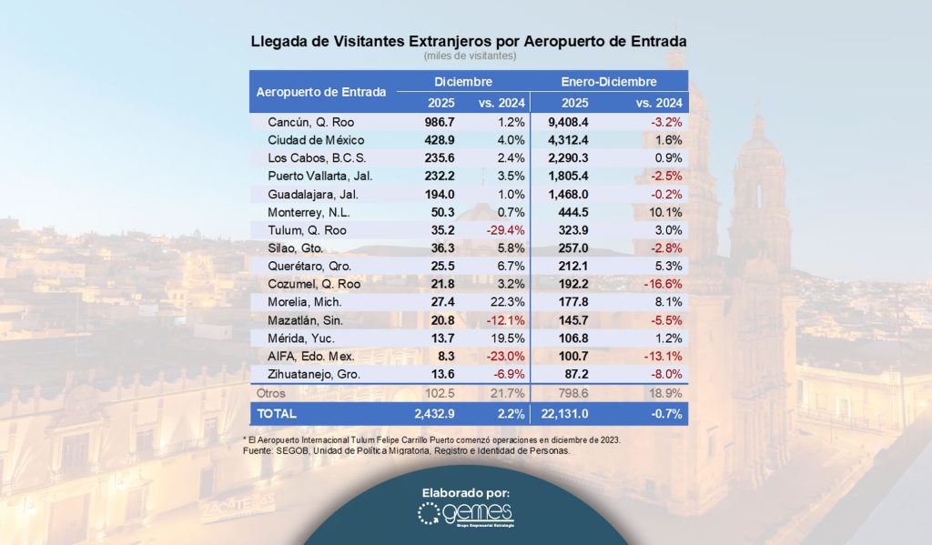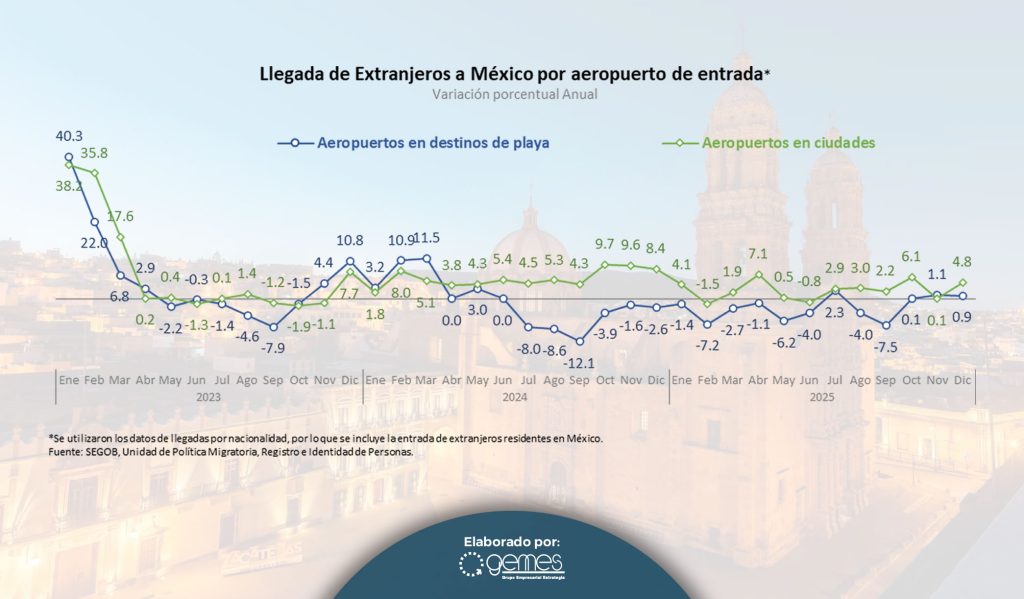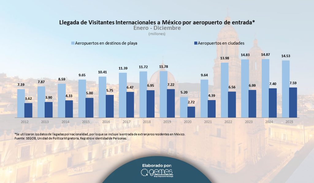 Finalmente, con crecimientos en la mayoría de los destinos durante el mes de diciembre y disminuciones, particularmente en los principales destinos de playa en el acumulado enero-diciembre de 2025, se refuerza la tendencia general de que México implemente una estrategia para evitar la pérdida de llegadas de países clave.