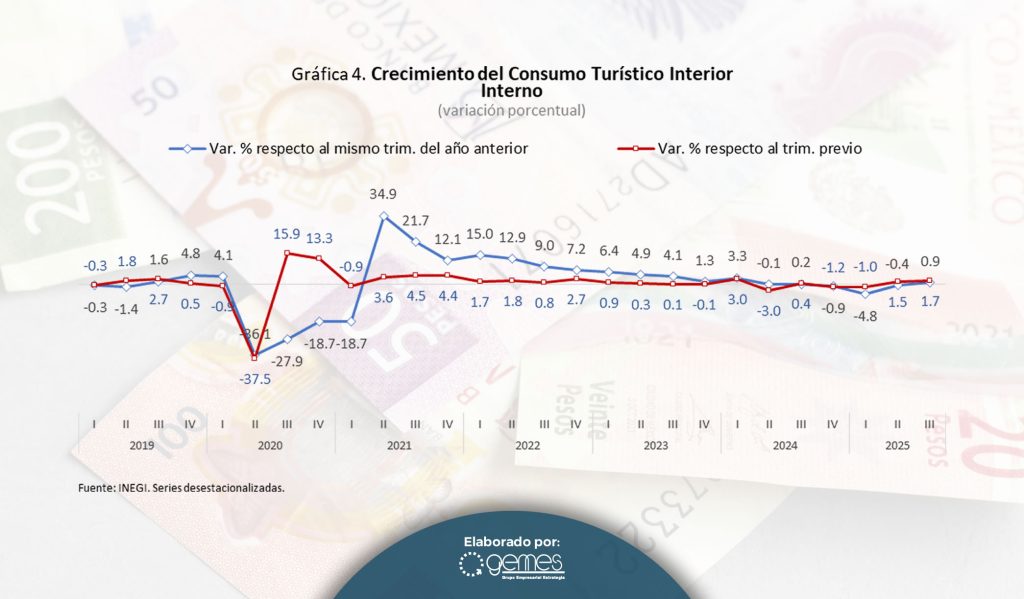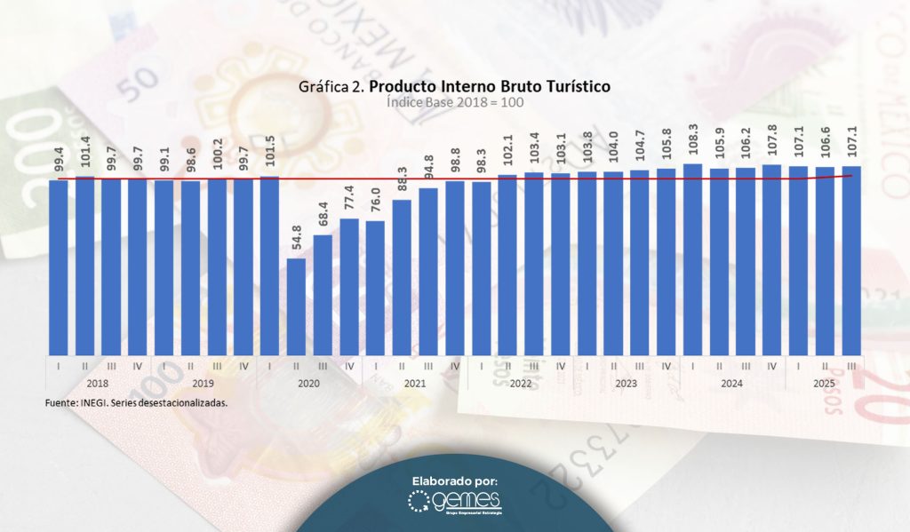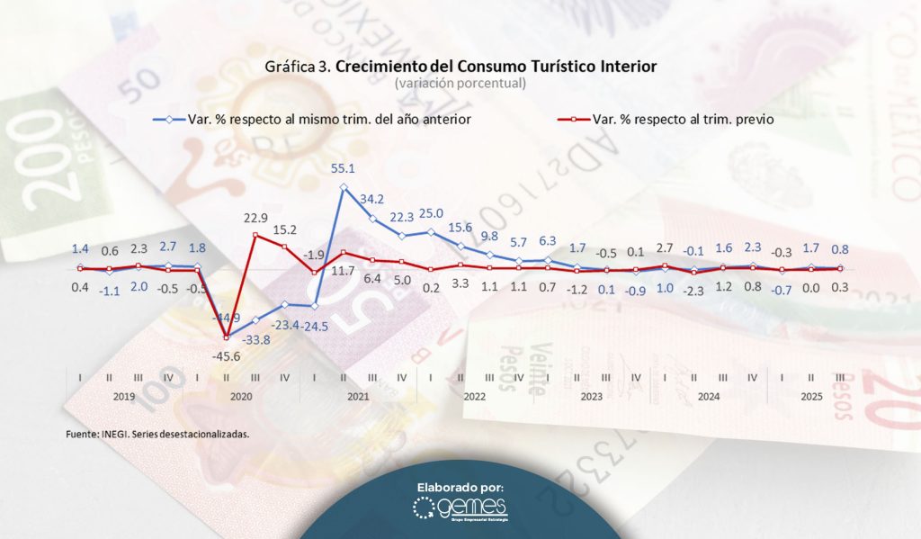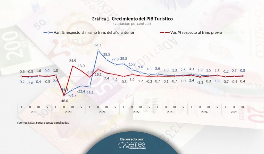 El PIB turístico se incrementó 0.8%, a tasa anual, en el tercer trimestre del 2025.
