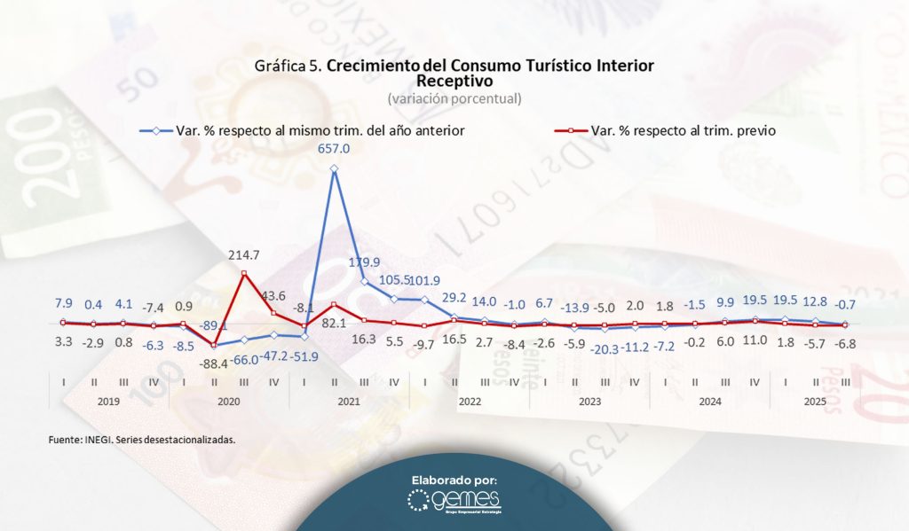 No obstante este resultado favorable, para todo el período enero-septiembre del año pasado el PIB turístico permaneció prácticamente estancado con un incremento anual de apenas 0.1%, por lo que se puede pronosticar que, cuando se publiquen los resultados finales del año 2025, el sector turismo mostrará su peor resultado de los últimos años con un incremento no mayor al 0.5%. De acuerdo al INEGI, el PIB turístico creció 2.8% en 2023 y 2.5% en 2024.