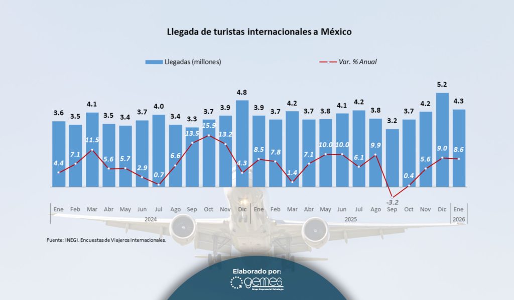 Con base en las Encuestas de Viajeros Internacionales, cuyos resultados son publicados mensualmente por el Inegi, en el mes de enero llegaron a México 4.3 millones de turistas internacionales, cerca de 340 mil turistas más que en el mismo mes de 2025; es decir un crecimiento de 8.6%. Este incremento anual en el primer mes del año en curso es ligeramente inferior en -0.4 puntos porcentuales al registrado en diciembre del año pasado.