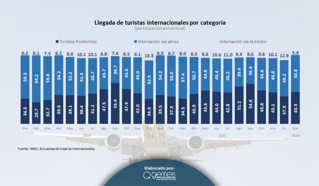 El turismo fronterizo a pesar de registrar caídas en su participación en el total de turistas durante los últimos tres meses del 2025, durante el mes de enero de 2026 aumentó su participación al 43.3% que es 3.8 puntos porcentuales mayor que en el mismo mes del año 2025. Durante el mes de enero la participación del turismo terrestre representó el 5.9% del total de turistas.