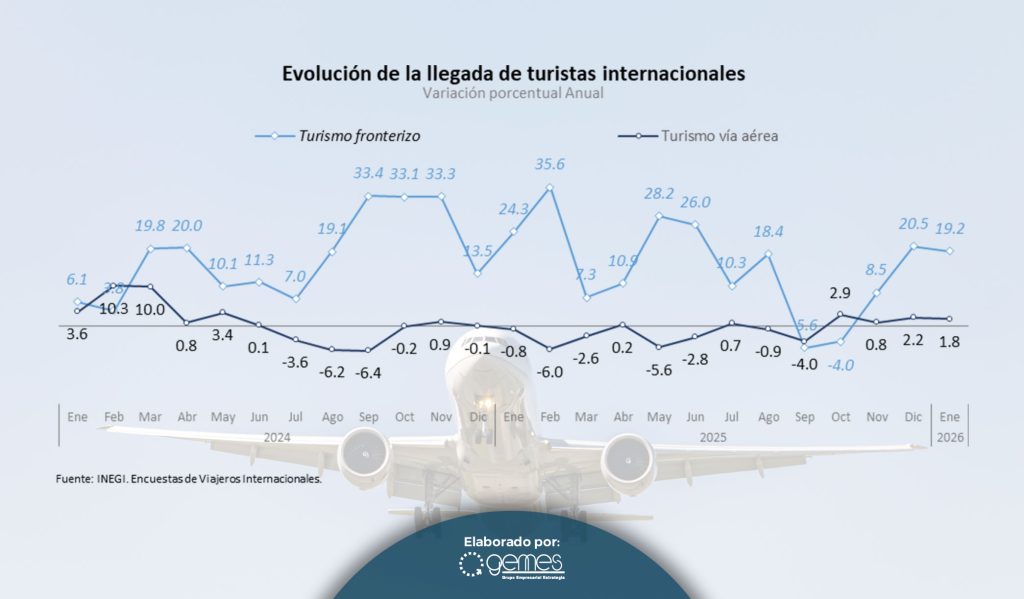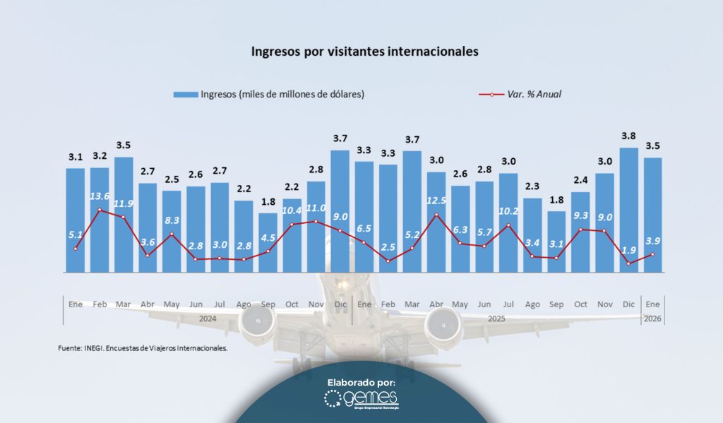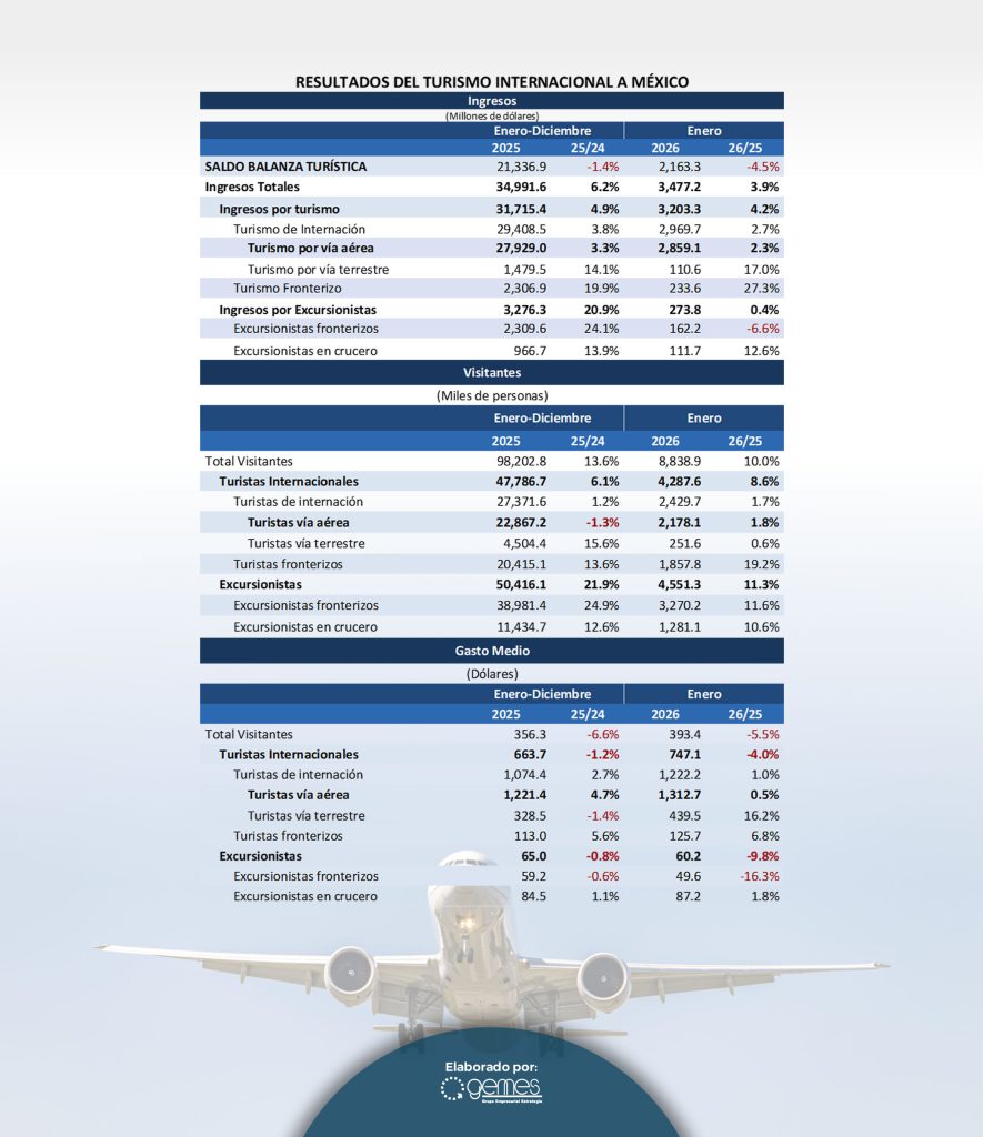 El comportamiento que tuvo el turismo internacional que llega a México durante el mes de enero de 2026 es positivo en cuanto al crecimiento en el número de visitantes, sin embargo se continúa observando que son los segmentos de turistas de menor gasto los que están creciendo de forma más dinámica.