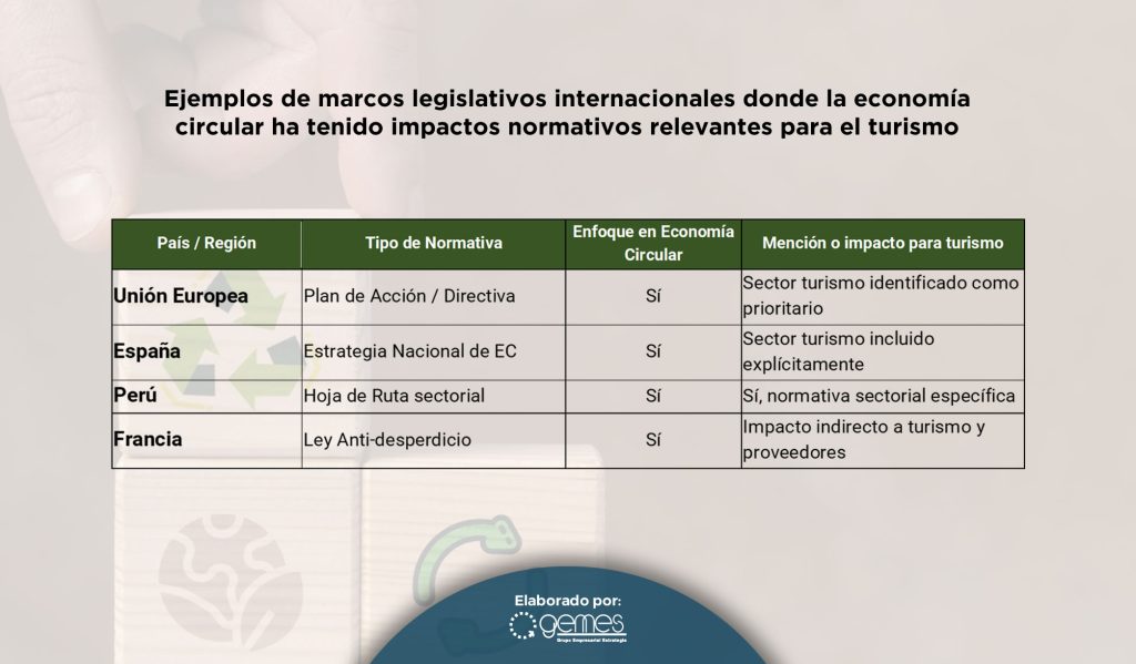 Para analizar los avances en otros países sobre la adopción de los principios de la economía circular, presentamos una breve lista de marcos legislativos y políticas públicas internacionales donde la economía circular ha tenido impactos normativos relevantes y, en algunos casos, se ha incorporado de forma explícita o implícita al sector turismo o ha generado condiciones regulatorias que afectan directamente a actividades turísticas: